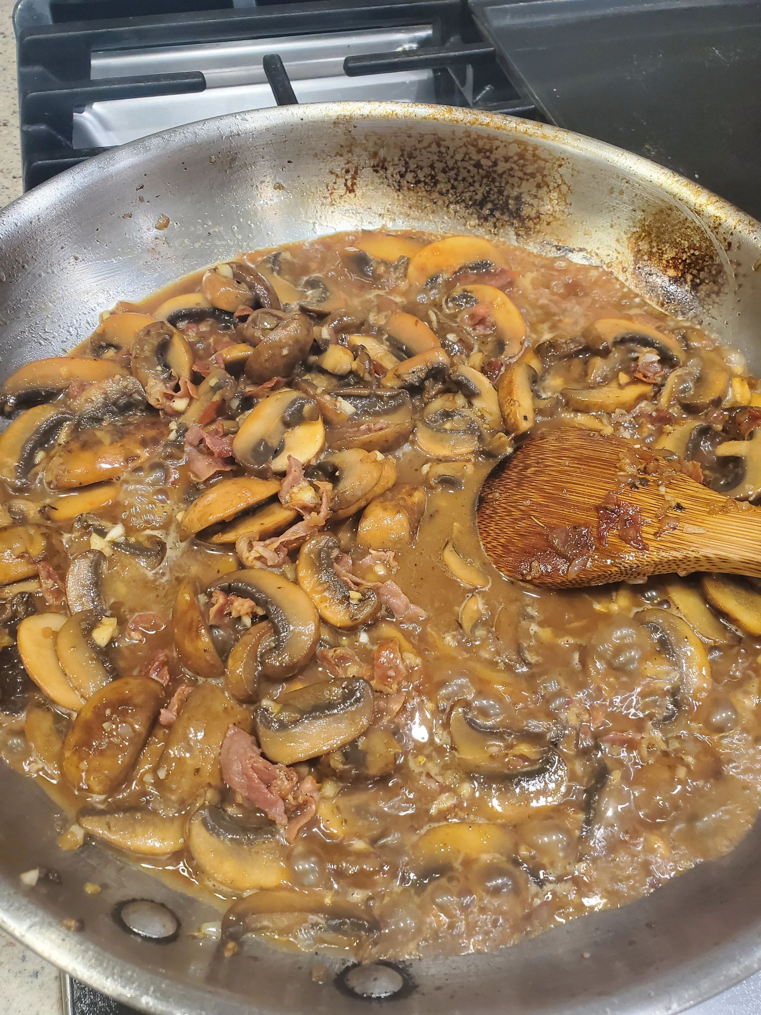 It’s time to make the sauce! This sauce does not take long at all, but you should have your ingredients ready to go so this will be easy! Melt 1/3 cup butter in your pan that has all of that beautiful fond. Melt the butter on medium- low heat to keep if from burning. Once the butter is melted, turn up the heat to medium- medium high and add your chopped prosciutto. Sauté for 2- 3 minutes. PLEASE make sure you keep an eye on the butter. We do not want it to burn! Burnt butter will make you have a bitter and burnt tasting sauce. Once the prosciutto has rendered, add the mushrooms and the shallots. Cook until the vegetables are soft and then add in the minced garlic. You will be able to smell the garlic when it is ready. This will take about 20-30 seconds.